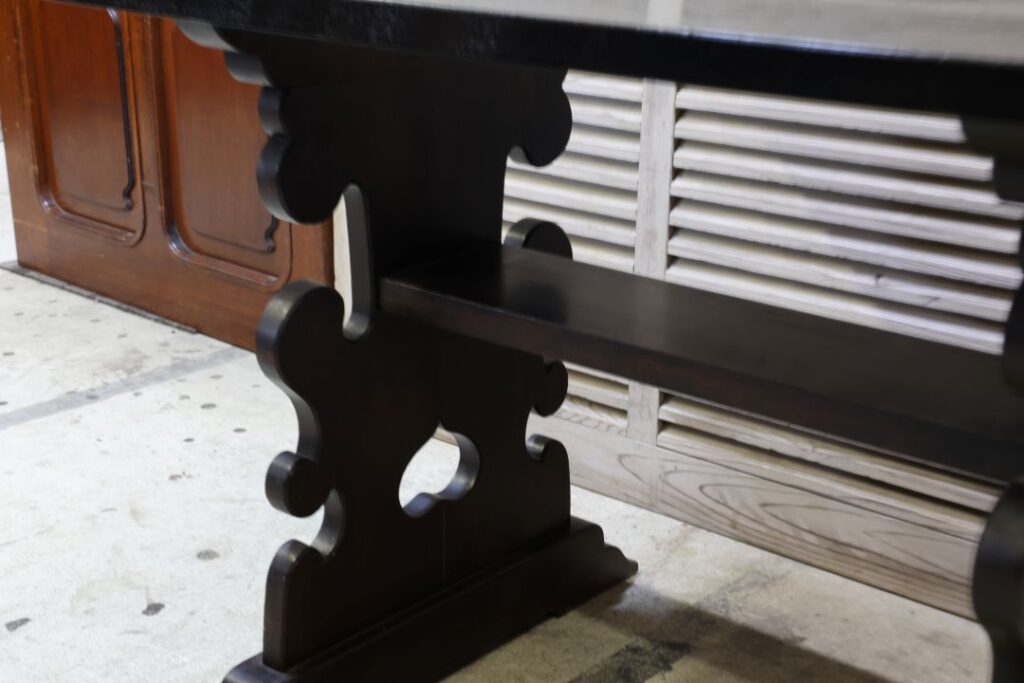 このテーブルの主役は、なんといってもその印象的な脚部です。 これは、イギリスの伝統的な「ウィンザーチェア」の背もたれなどに見られる「スプラット(板状の背割り)」のデザインをモチーフにしています。西洋アンティークのような風格がありつつも、松本民芸家具の落ち着いた深い色合いのおかげで、畳の和室にもモダンな洋室にも驚くほど自然に馴染んでしまいます。