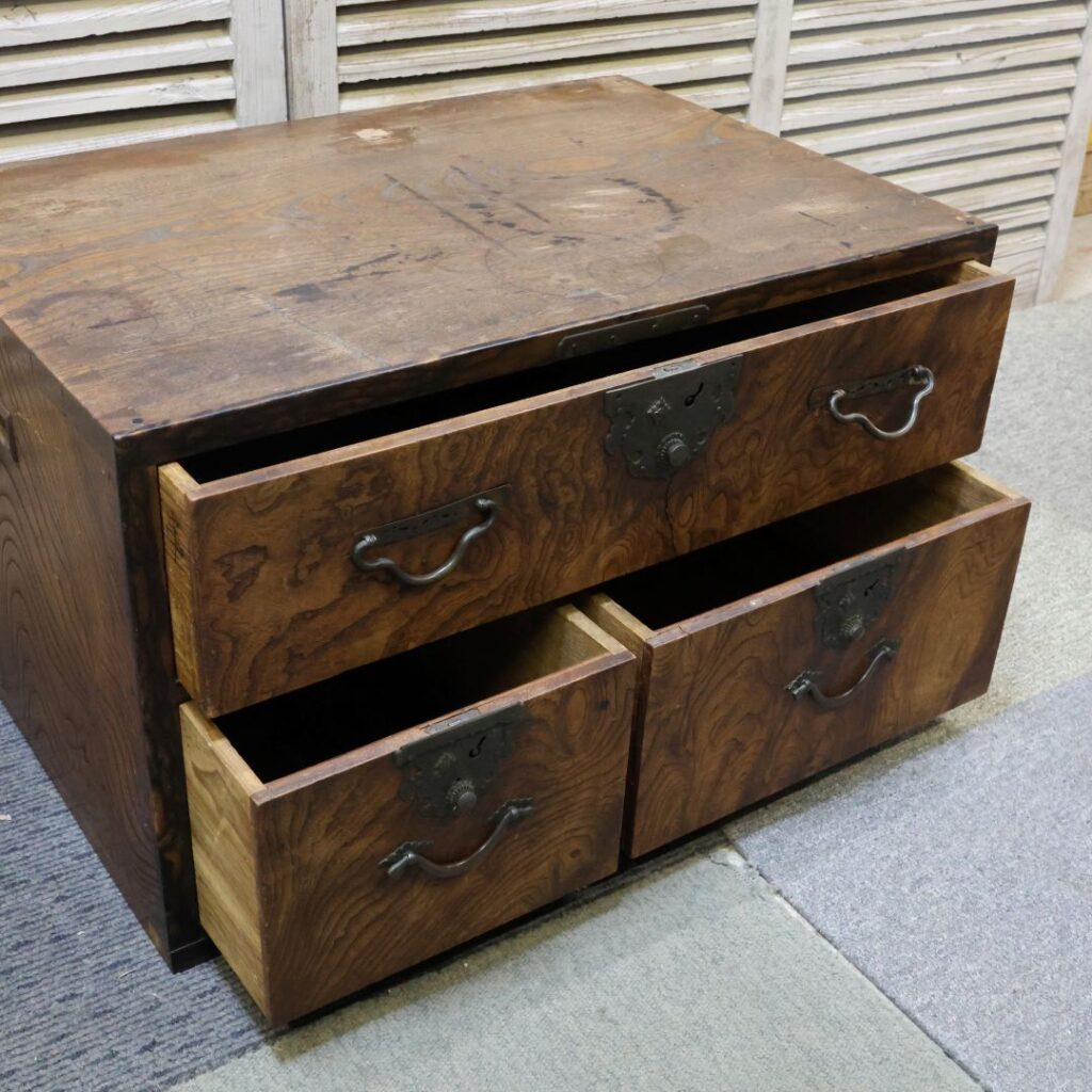 意外なことに、こうした時代箪笥は現代のモダンなインテリアや、コンクリート打ち放しの空間にも非常によく映えます。お写真のような小ぶりなサイズ(小箪笥・舟箪笥など)は、サイドテーブルやチェストとして実用性も高く、一点置くだけで部屋の「顔」になります。