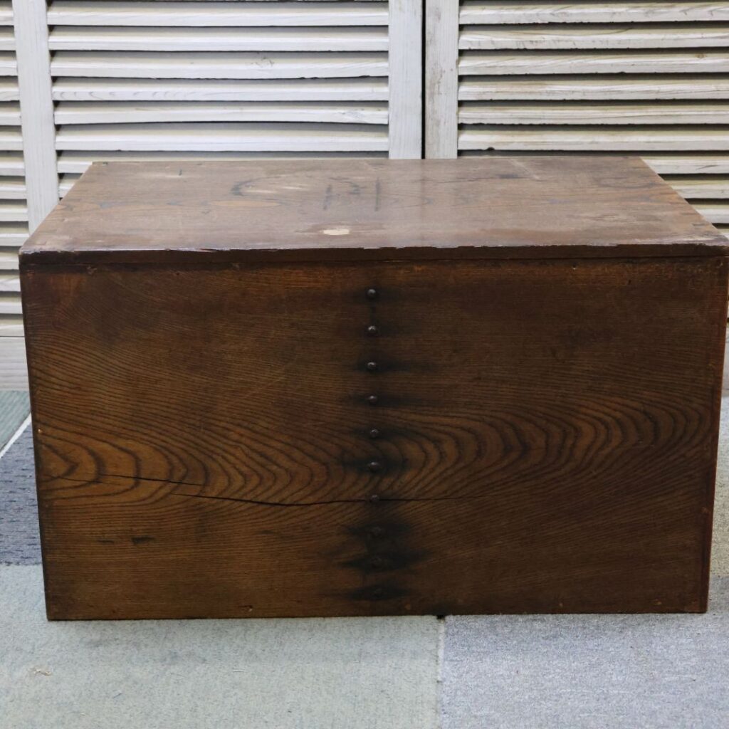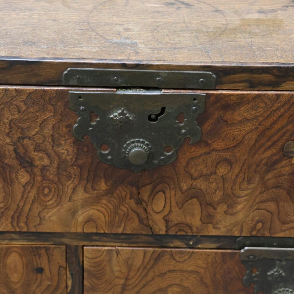 箪笥は、ケヤキ(欅)などの良質な材が使われていると思われます。特に前面に見られる渦を巻くような「玉杢(たまもく)」や「牡丹杢」に近い複雑な紋様は、厳しい自然環境で育った証であり、プリント化粧板では決して再現できない生命力を感じさせます。