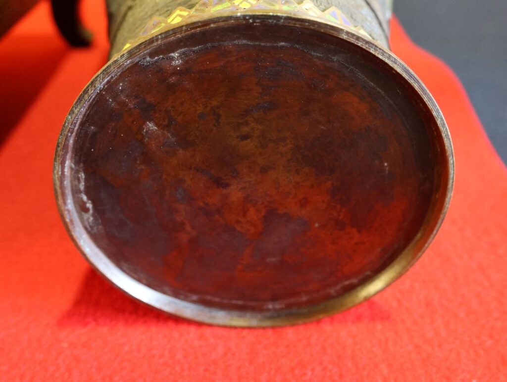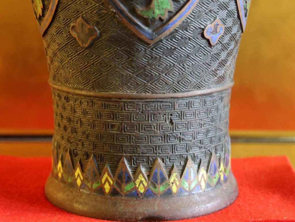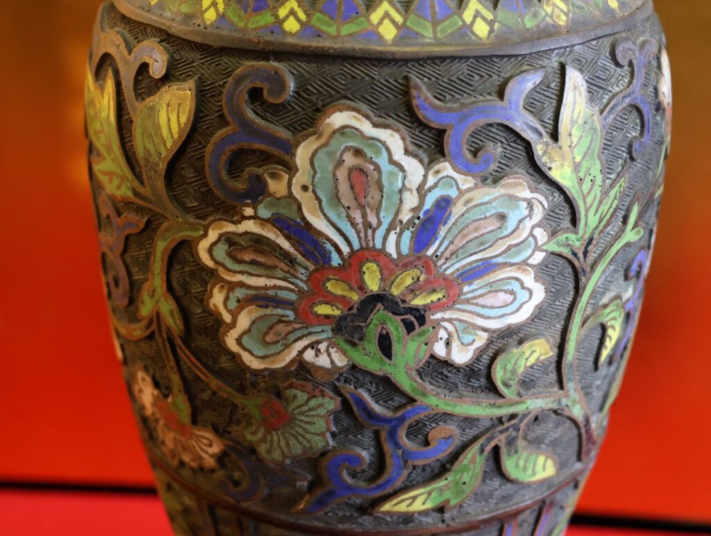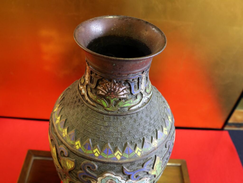 - 金属線: 模様の輪郭を作る金属線(植線)が太めで、装飾としての力強さが強調されています。お写真の作品も、花の輪郭がしっかり際立っており、工芸品としての存在感が抜群です。