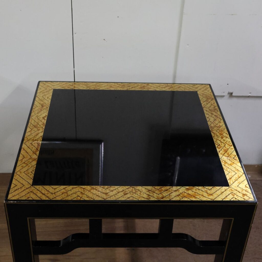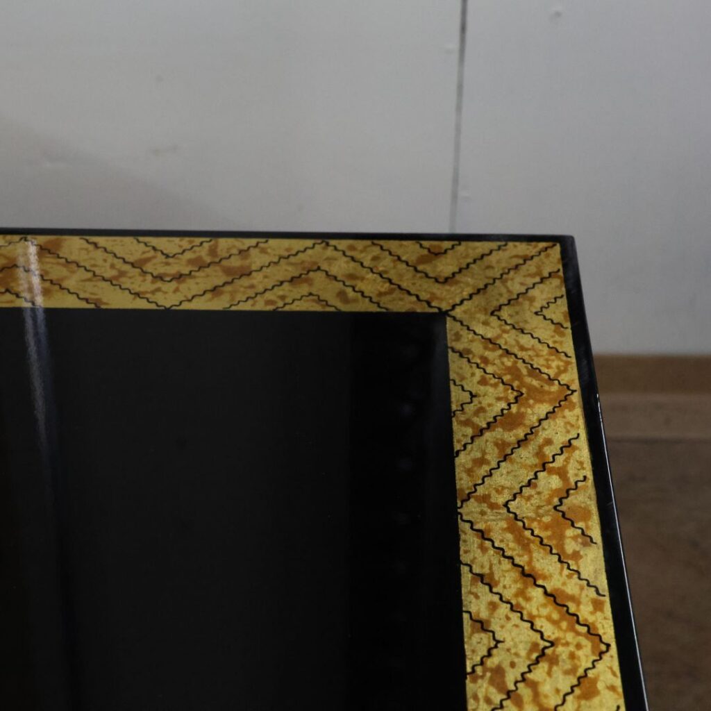 • 計算されたコントラスト: 天板の縁に施された、大理石や縮み杢(ちぢみもく)のような質感のゴールド系ボーダーが、黒の重厚感に「軽やかさ」と「華やかさ」を加えています。