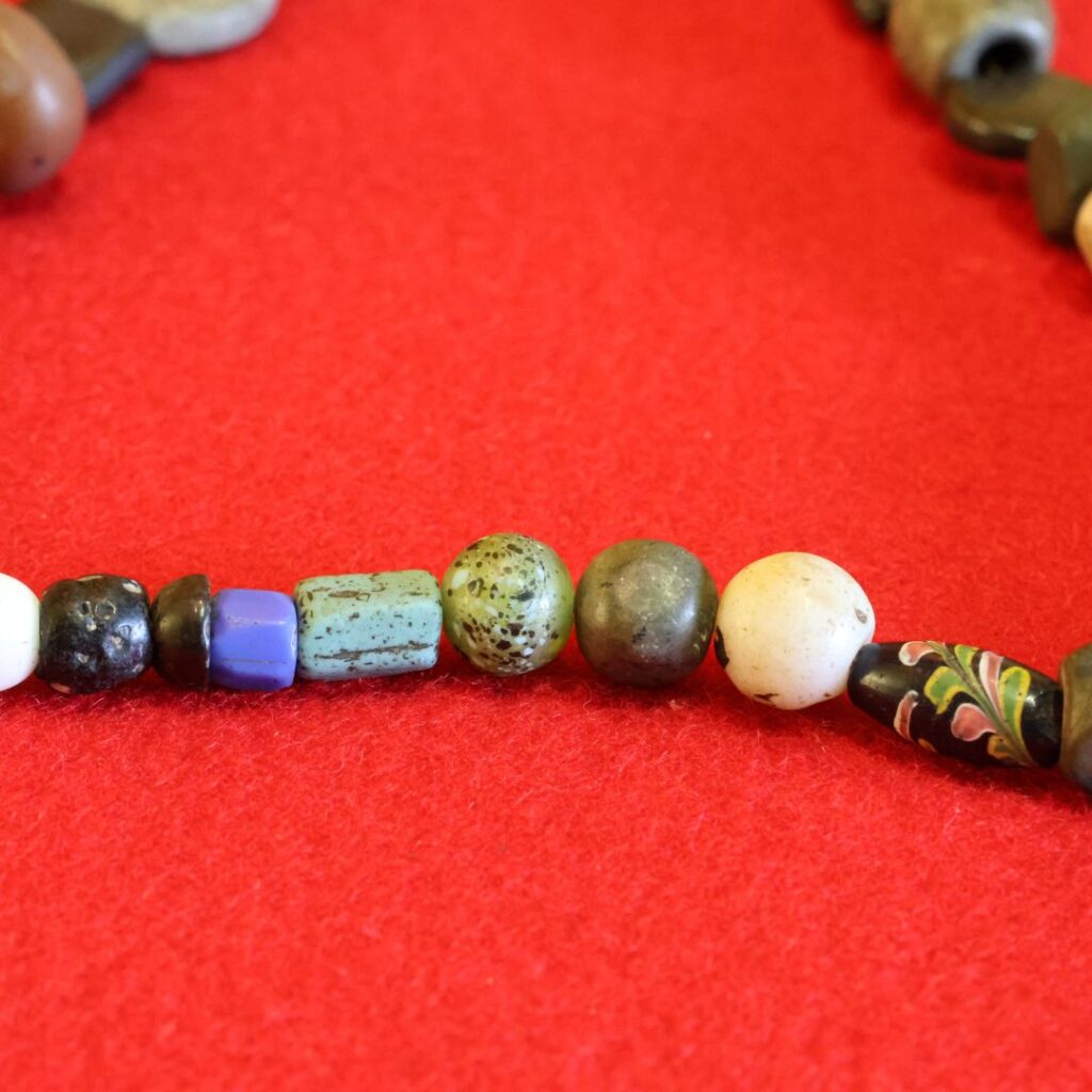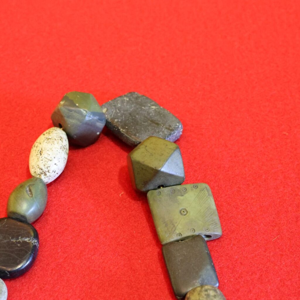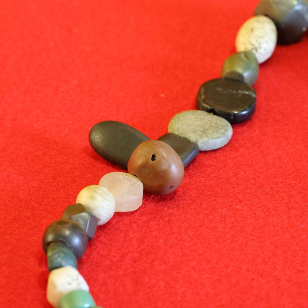 - 様々な色や形の石(ジャスパー、アゲート、あるいはその他の天然石の可能性)が組み合わされており、素材一つ一つに個性があります。これは、天然の素材を活かし、装身具に自然の力や神秘性を込める古代の慣習とも関連しているかもしれません。