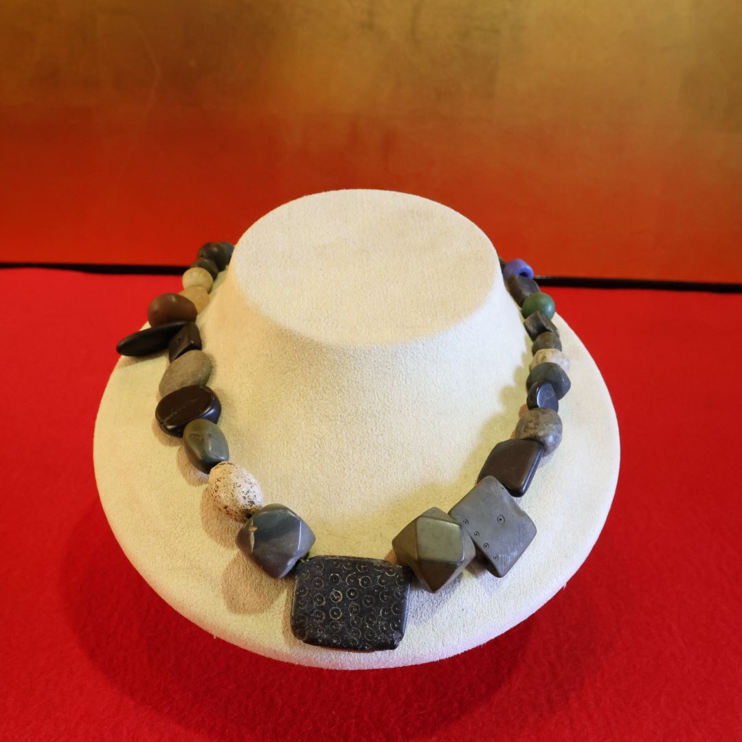 - 様々な色や形の石(ジャスパー、アゲート、あるいはその他の天然石の可能性)が組み合わされており、素材一つ一つに個性があります。これは、天然の素材を活かし、装身具に自然の力や神秘性を込める古代の慣習とも関連しているかもしれません。