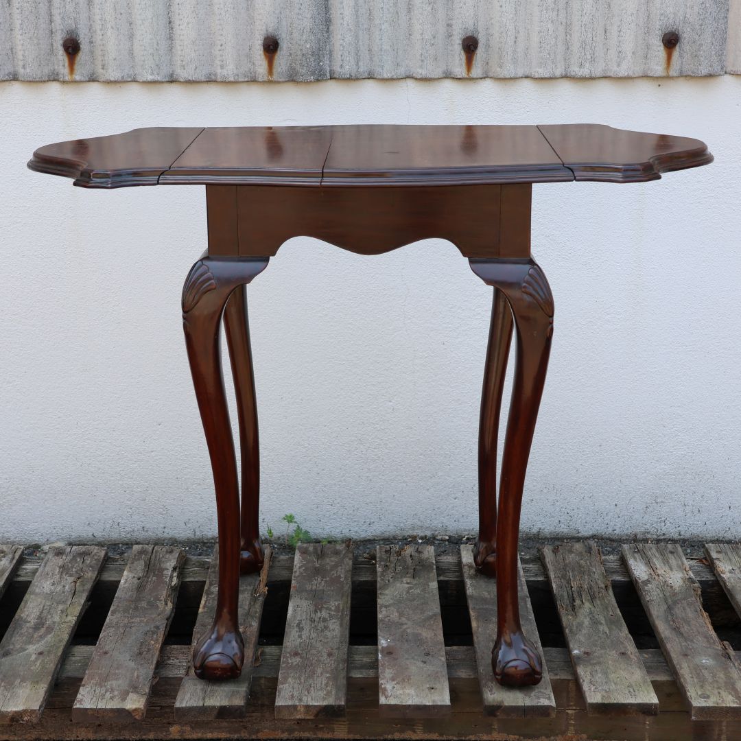 多くの場合、熟練した職人の手によって丁寧に作られており、美しい木目や装飾、そして優雅な曲線美が特徴です。特に、クイーンアンスタイルやジョージアンスタイルといった伝統的な様式は、現代の家具にはない独特の気品と温かみを持っています。画像の商品も、猫脚(カブリオールレッグ)と呼ばれる曲線的な脚や、天板の縁の装飾など、クラシカルでエレガントな雰囲気が漂っていますね。このような細部に宿る職人技は、長く愛用するほどにその価値を増していきます。普段はコンパクトなサイドテーブルとして、必要な時には天板を広げてより広いスペースを確保できるという、非常に実用的な機能を持っています。来客時や作業スペースを増やしたい時など、様々なシーンで活躍してくれます。限られたスペースを有効活用したい日本の住環境にも適しており、普段は場所を取らず、必要な時だけ広げられるのは大きなメリットです。