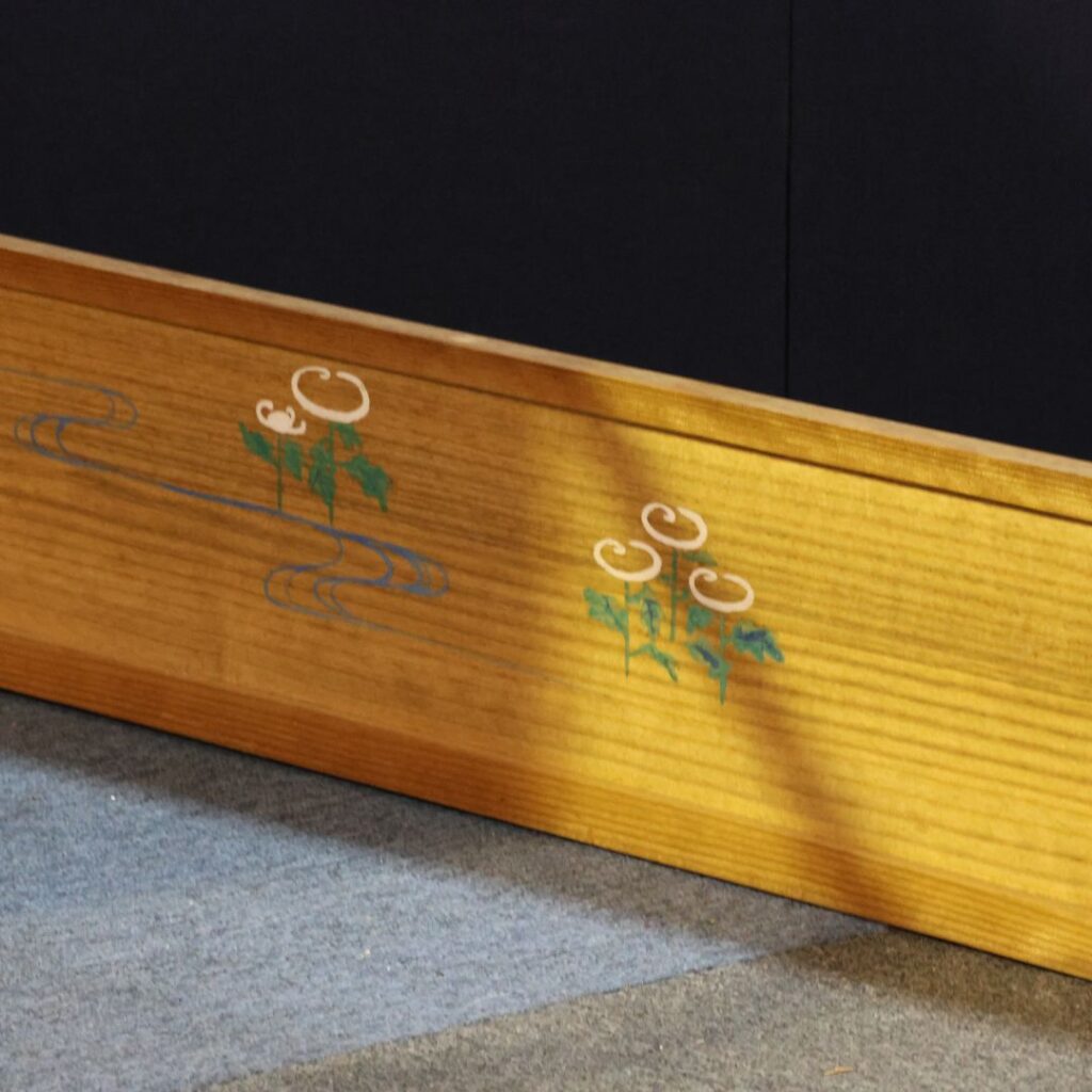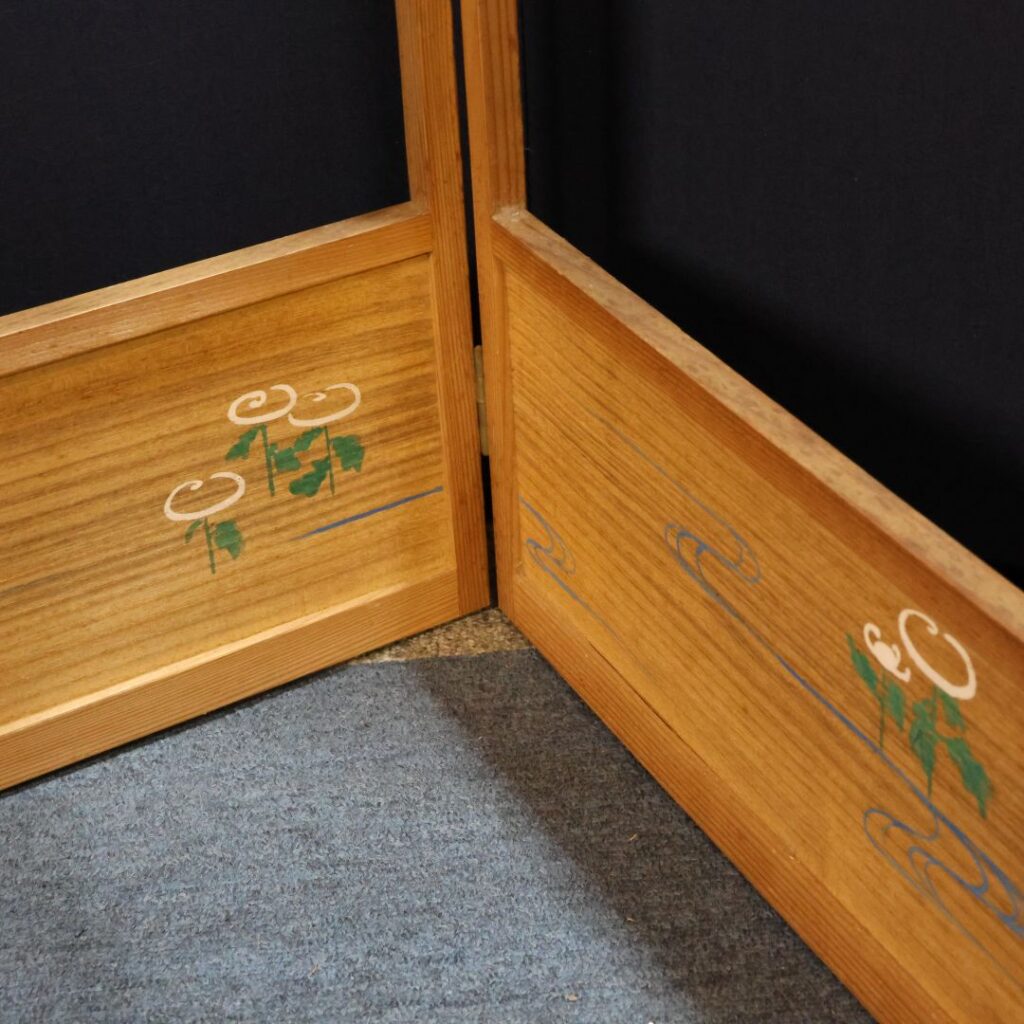 - 下部の板戸に描かれた**控えめな草花(花、葉、茎)**の絵柄が、全体の落ち着いたトーンを保ちつつ、優しく自然なアクセントになっています。
