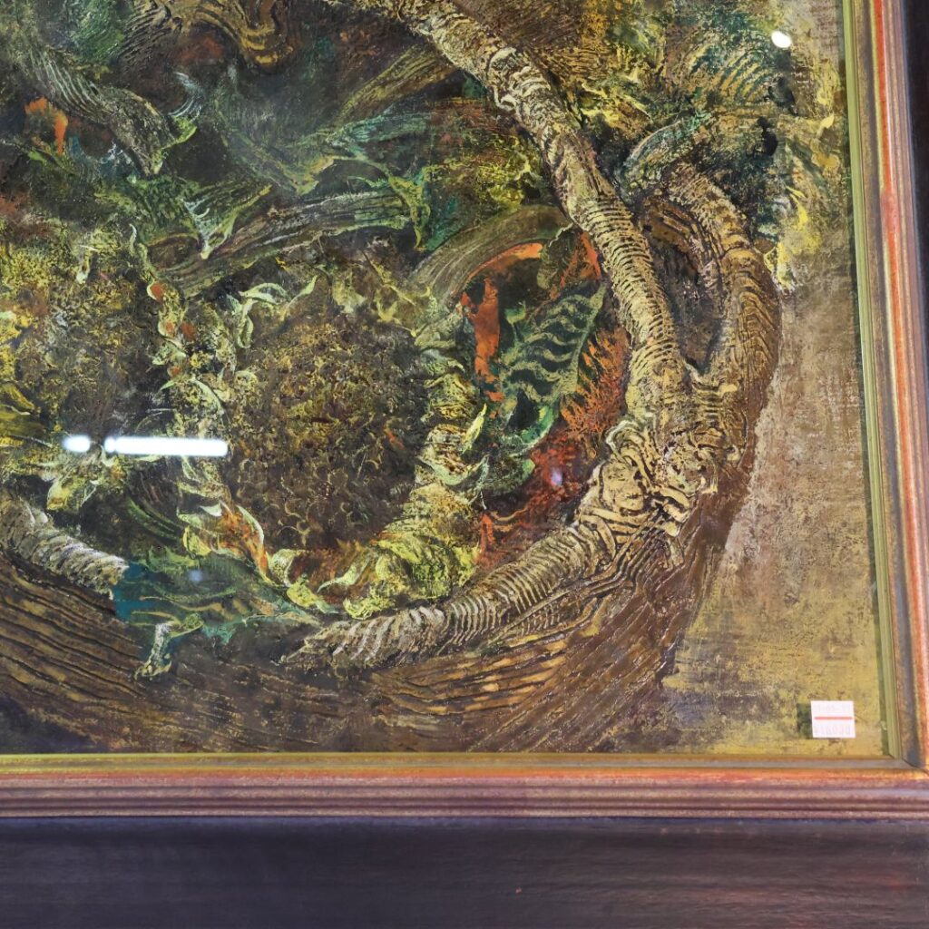 - 色彩: 主に深緑、茶、黒といった重厚な色調を基調としながら、ひまわりの花には鮮やかな黄色、オレンジ、金などが差し込まれています。このコントラストが、作品に深みと力強さを与えています。