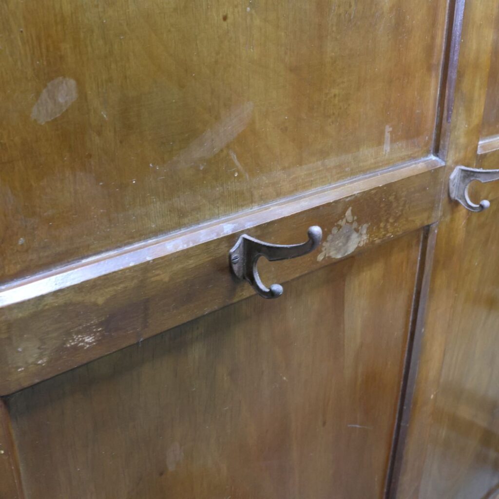 このスタンドの最大の魅力は、その佇まいです。教会の備品や古い洋館を思わせるパネル加工(鏡板)と、年月を重ねた木の質感が、玄関やエントランスに「家の顔」としての威厳を与えてくれます。置くだけでその空間にストーリーが生まれるような、美術品に近い存在感があります。