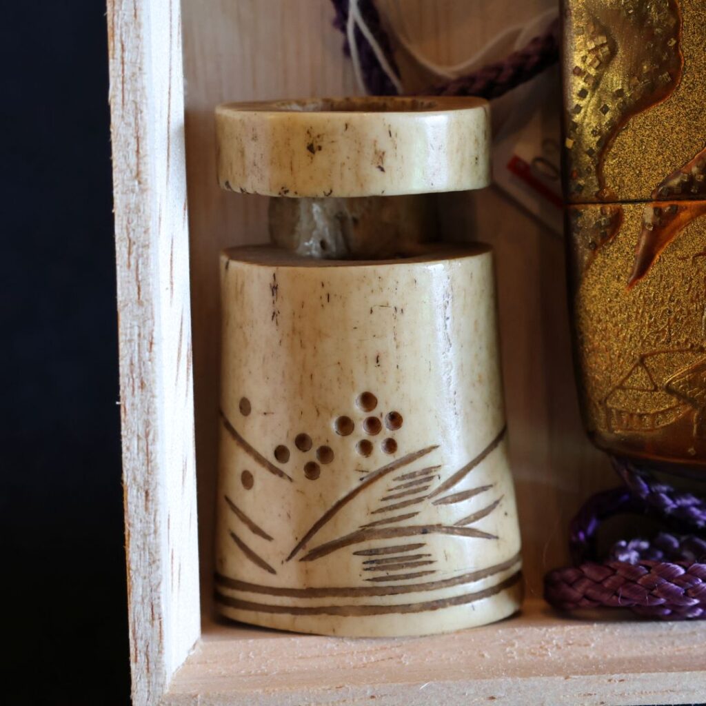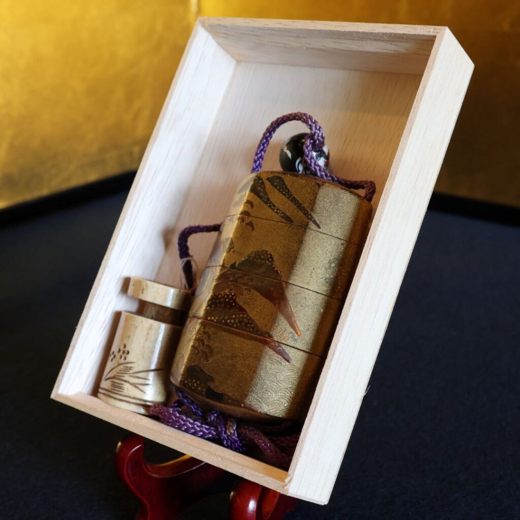 - 蒔絵の美しさ: 印籠は江戸時代、実用品であると同時に武士などの**装身具(アクセサリー)**として発達しました。画像からも、金色の地に黒や赤の漆で山水風景が描かれ、非常に緻密な蒔絵の技術が使われていることが分かります。このような精巧な漆工芸品は、高度な職人技の結晶であり、その美しさ自体が大きな魅力です。