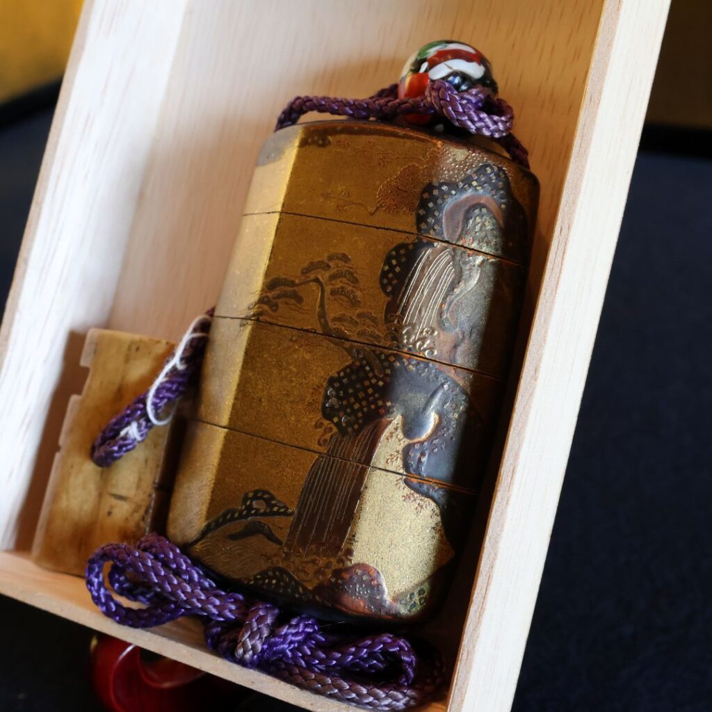 - 立体感と奥行き: 滝と松というモチーフは、風景画としても奥行きを表現しやすく、印籠の小さな空間に壮大な自然の景色を凝縮する意匠の巧みさがあります。四段の印籠であれば、段と段の継ぎ目も柄の一部として繋がるようにデザインされているはずで、全体として一つの絵巻物のような良さがあります。