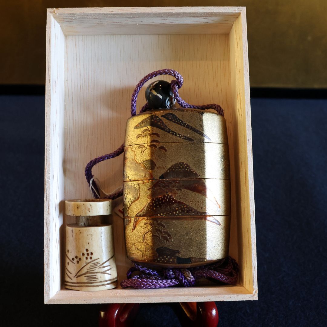 - 立体感と奥行き: 滝と松というモチーフは、風景画としても奥行きを表現しやすく、印籠の小さな空間に壮大な自然の景色を凝縮する意匠の巧みさがあります。四段の印籠であれば、段と段の継ぎ目も柄の一部として繋がるようにデザインされているはずで、全体として一つの絵巻物のような良さがあります。