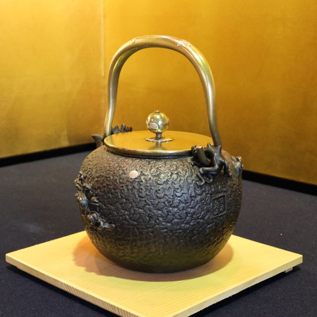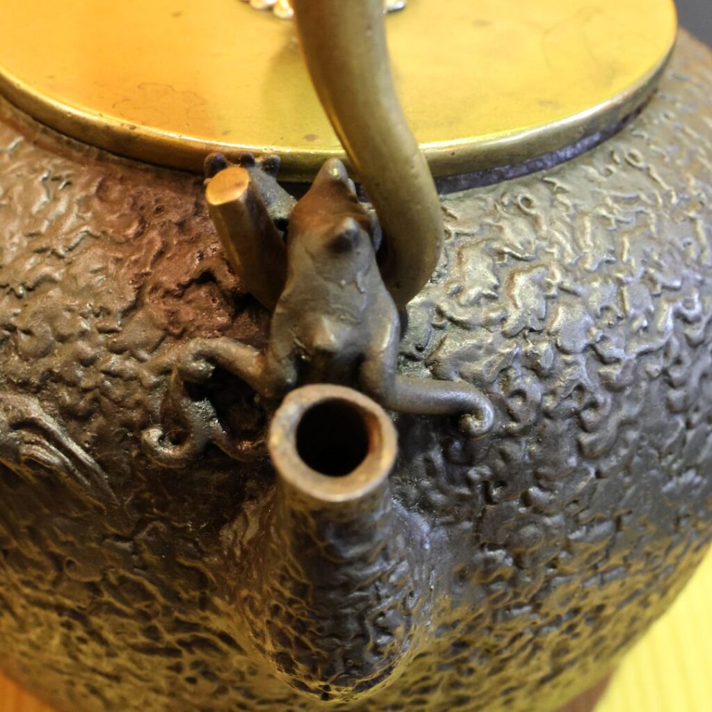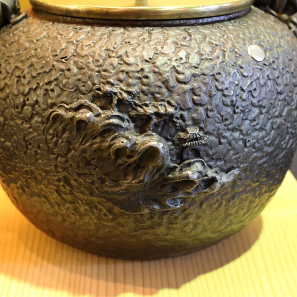 • 画像からも、波千鳥や、蓋の摘み(つまみ)、おそらく提げ手(さげて)にも銀や銅が使われ、本体の黒い鉄肌とのコントラストが美しく、装飾性を高めていることが分かります。