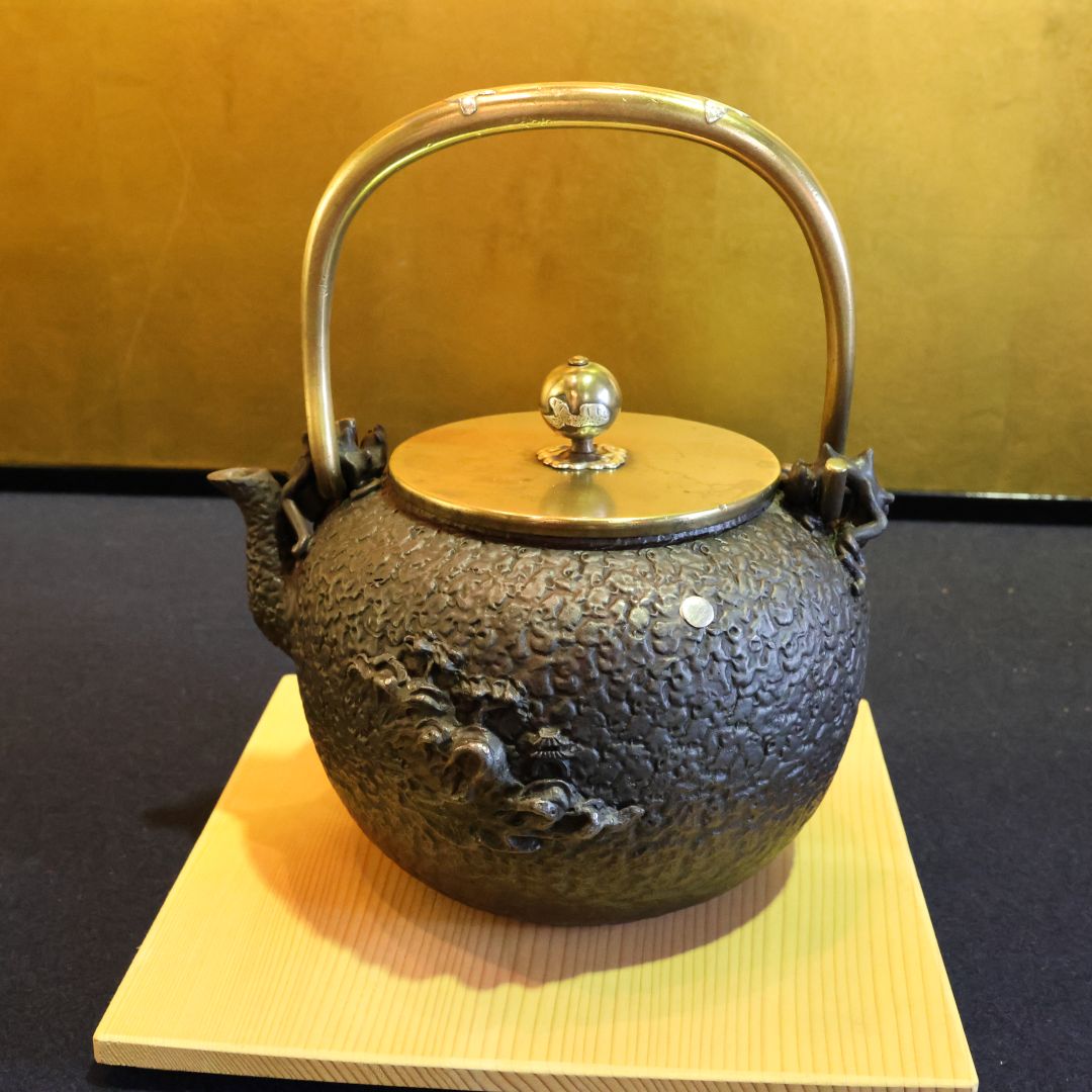 • 画像からも、波千鳥や、蓋の摘み(つまみ)、おそらく提げ手(さげて)にも銀や銅が使われ、本体の黒い鉄肌とのコントラストが美しく、装飾性を高めていることが分かります。