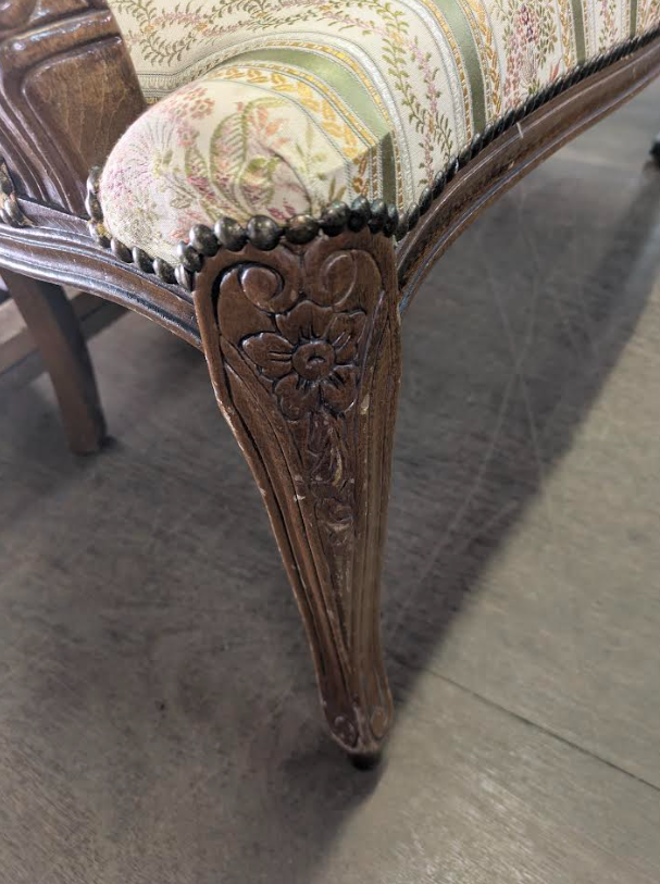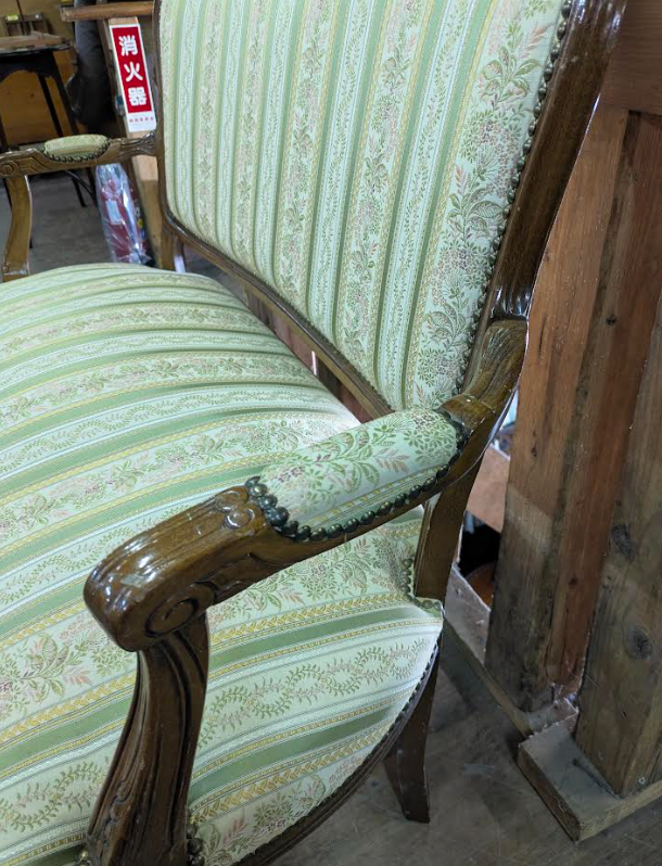• パイピングとスタッズ: 布地の縁を留める鋲(びょう)打ちやパイピングの仕上げも、クラシック家具ならではの意匠です。