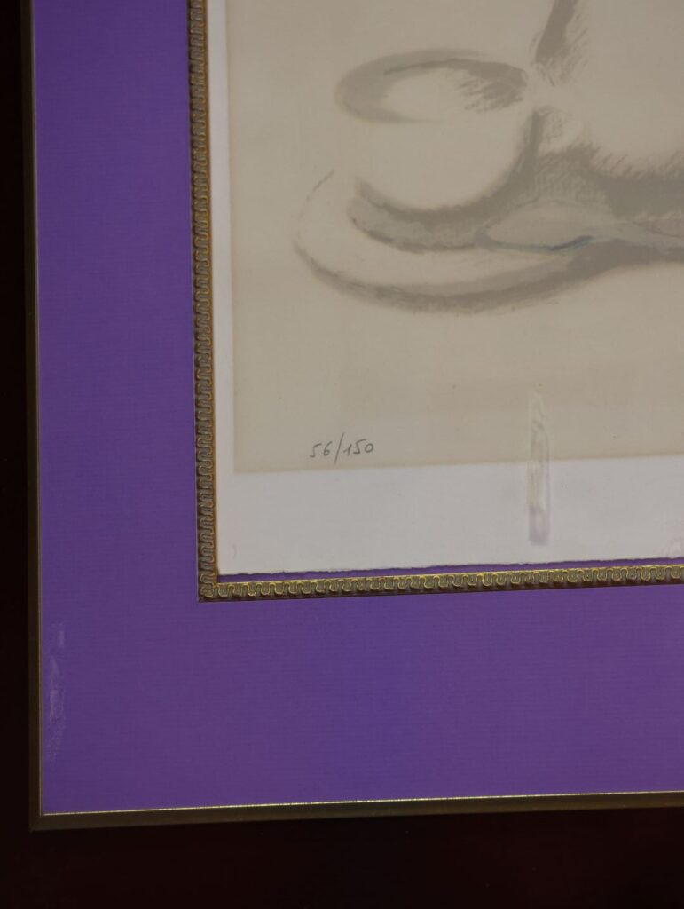 - 限定部数(エディション): 150部限定の作品であり、「56/150」というサインは、その部数の中で56番目に摺られたことを示しています。限定版画であるため、希少性があります。