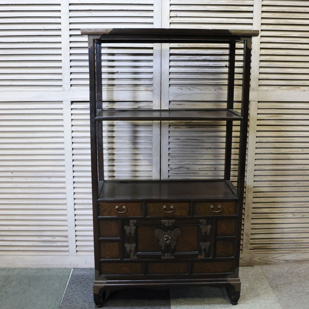 中央の扉にある大きな蝶の形をした金具は、李朝家具のアイコニックな装飾です。