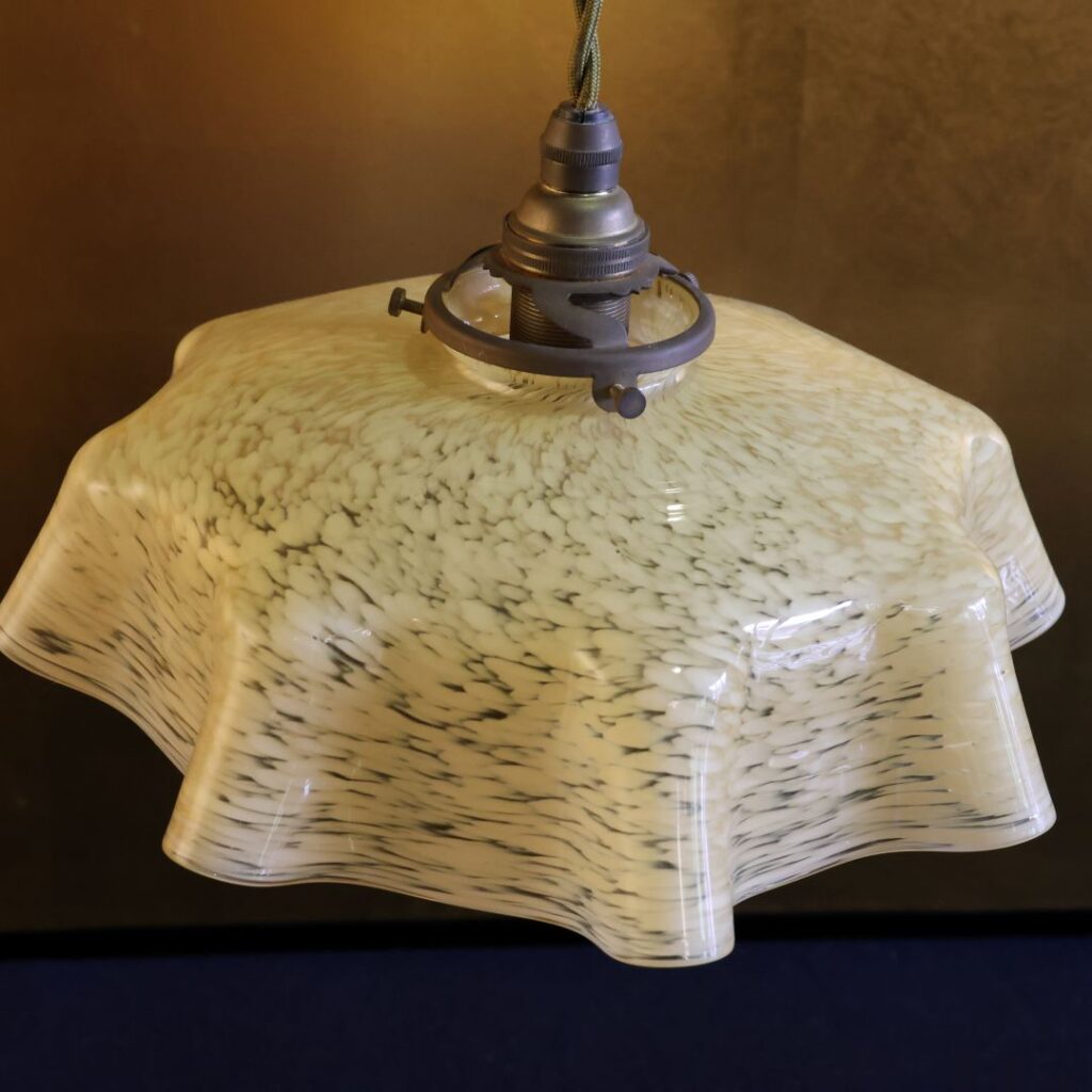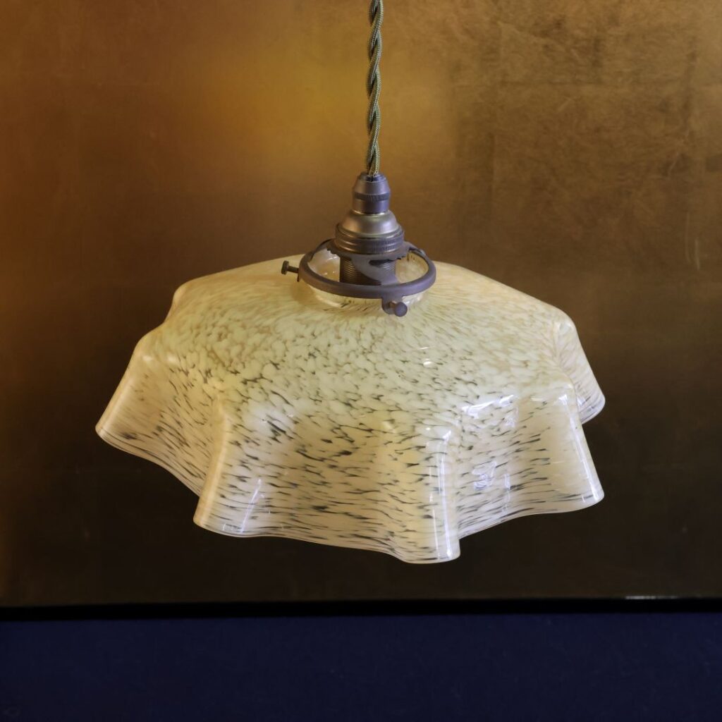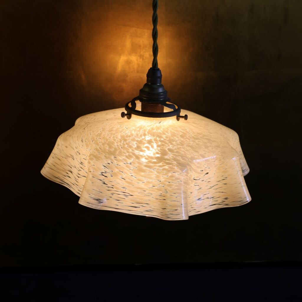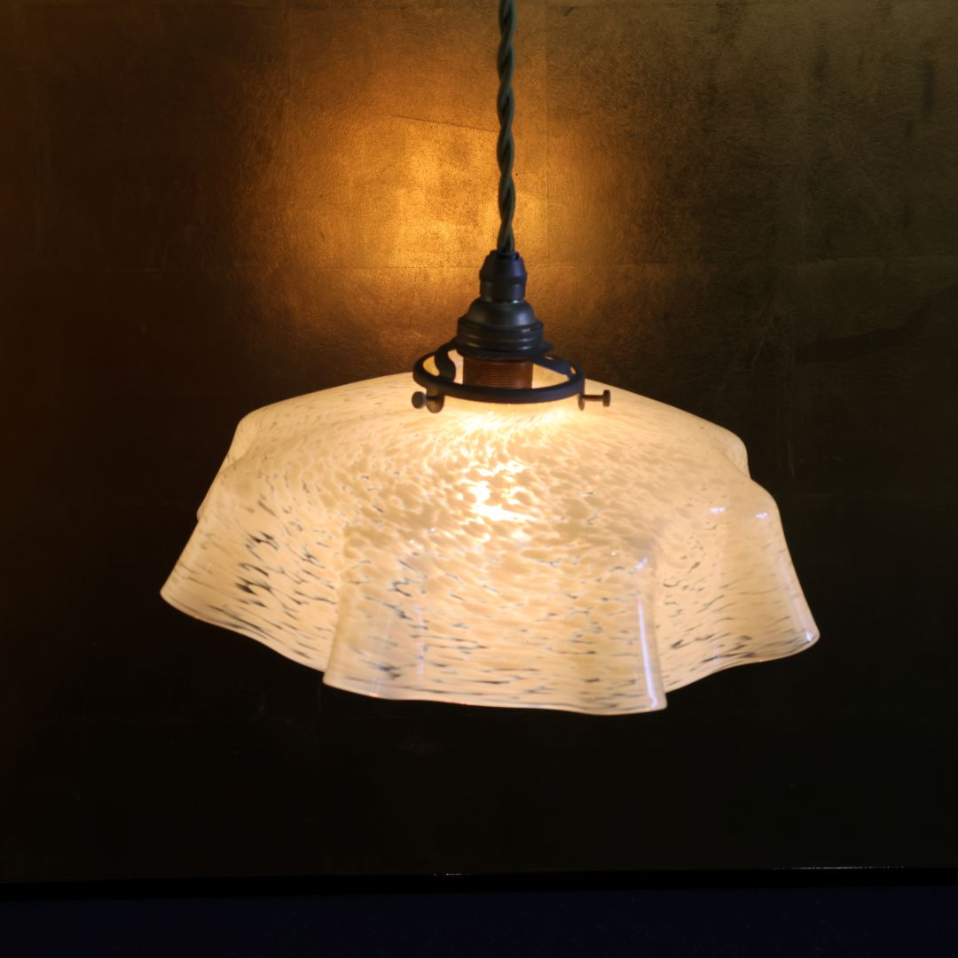 • ガラスの加工(マーブル模様/斑点模様): 画像のシェードは、淡いクリーム色や乳白色のガラスに、黒や濃い色の斑点のような模様(マーブル模様やスパッタリング)が散りばめられています。これは「斑ガラス」や「フェザーガラス」などと呼ばれることもあり、点灯すると光がこの模様を通して拡散され、非常に温かく、幻想的で複雑な光の表情を生み出します。