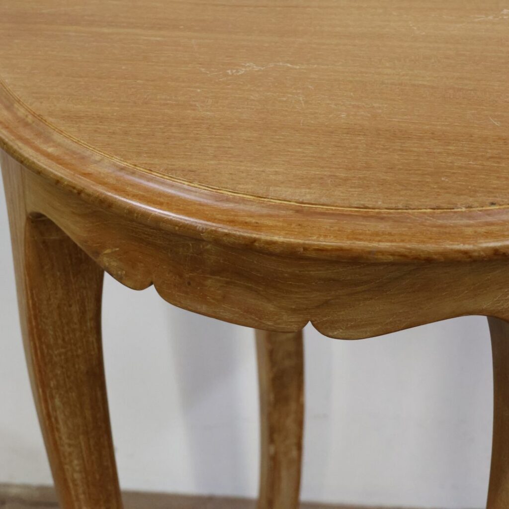 オーク材(ナラ材)は非常に硬く、耐久性に優れた「剛」の木材です。一方で、このテーブルのデザインは猫脚(カブリオールレッグ)や、天板下の幕板に施された波打つような曲線など、非常に優雅で「柔」の印象を与えます。