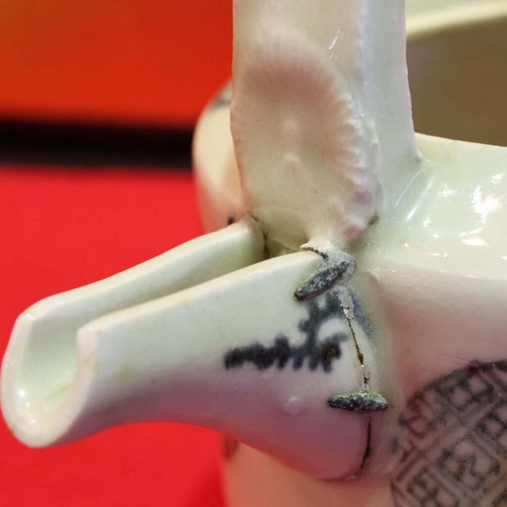 - 力強さ: 繊細な磁器に、武骨な金属の鎹が打ち込まれているコントラストは、金継ぎとはまた違った、力強く野性味のある美しさを放っています。
