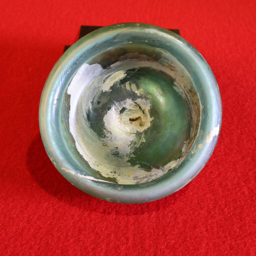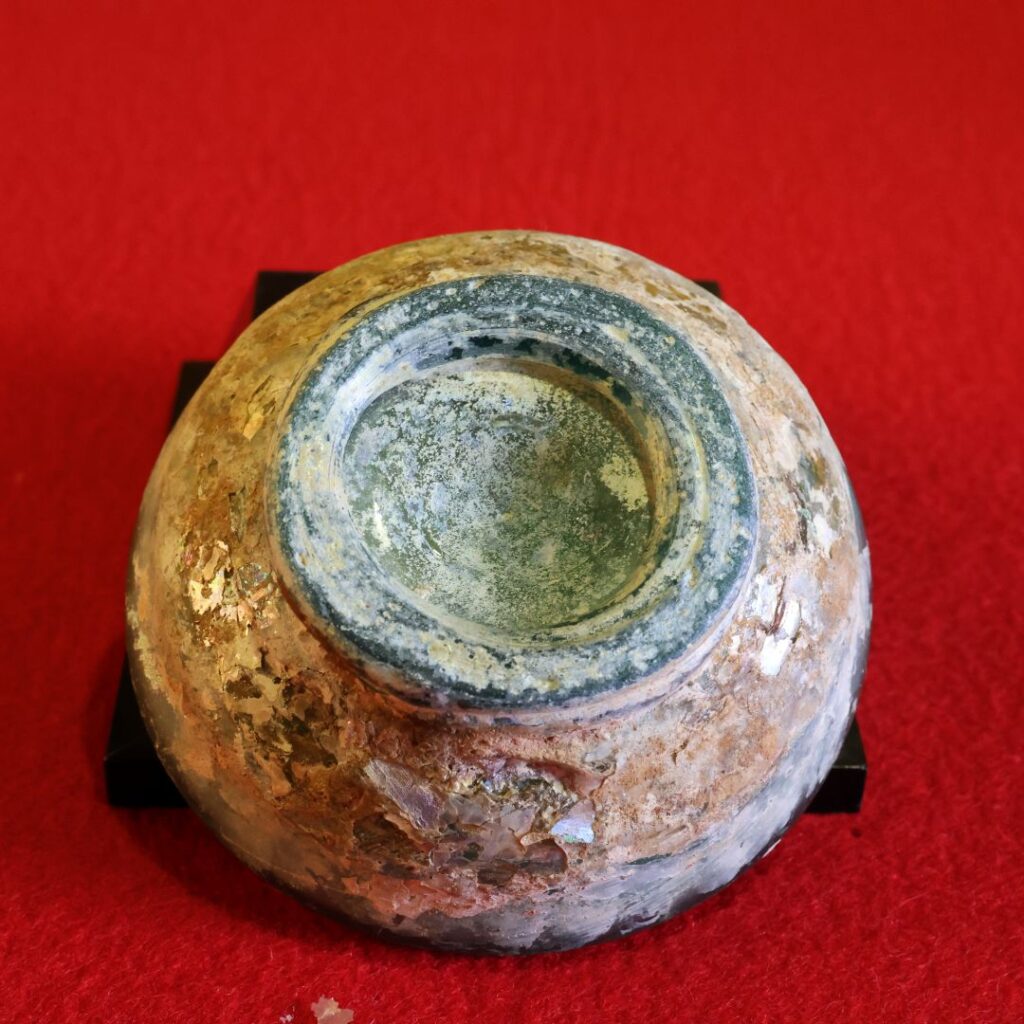 • ローマンガラスが数百年から2000年もの長い年月、地中に埋まっていたことで、ガラスの成分と土中の成分が化学反応を起こし、表面に薄い膜状の層ができます。