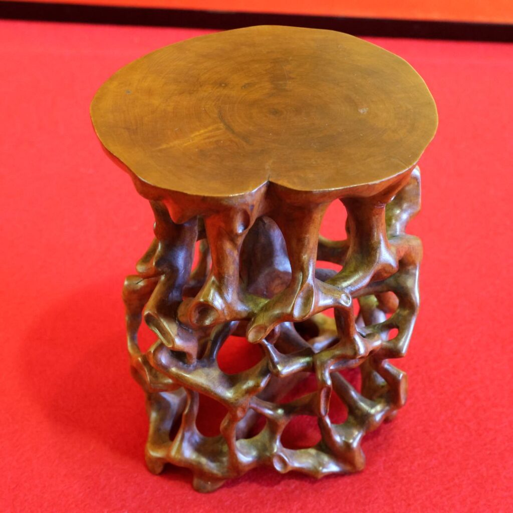 2. 主役(盆栽・水石・花器)を最高に引き立てる 根花台の最大の役割は「名脇役」であることです。