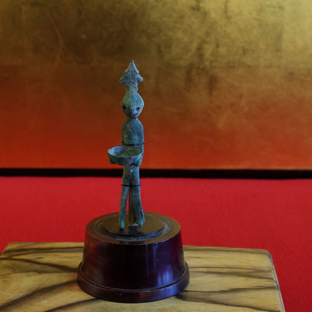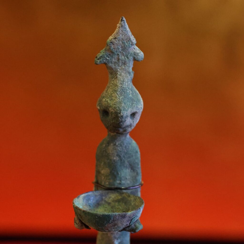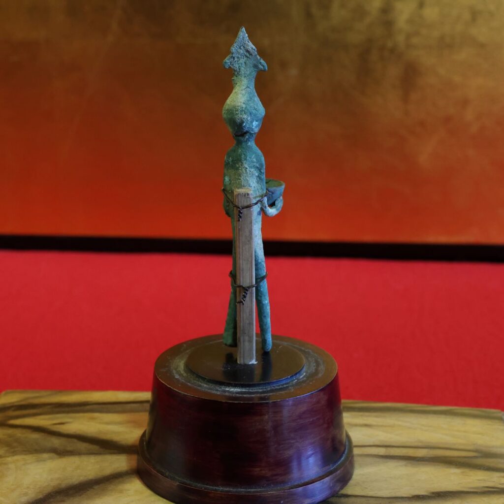 このスタイル(細長い身体、独特な頭飾、器を持つポーズ)は、地中海近辺(例えばサルデーニャ島のヌラーゲ文化など)や近東の古代文明のブロンズ像を彷彿とさせます。