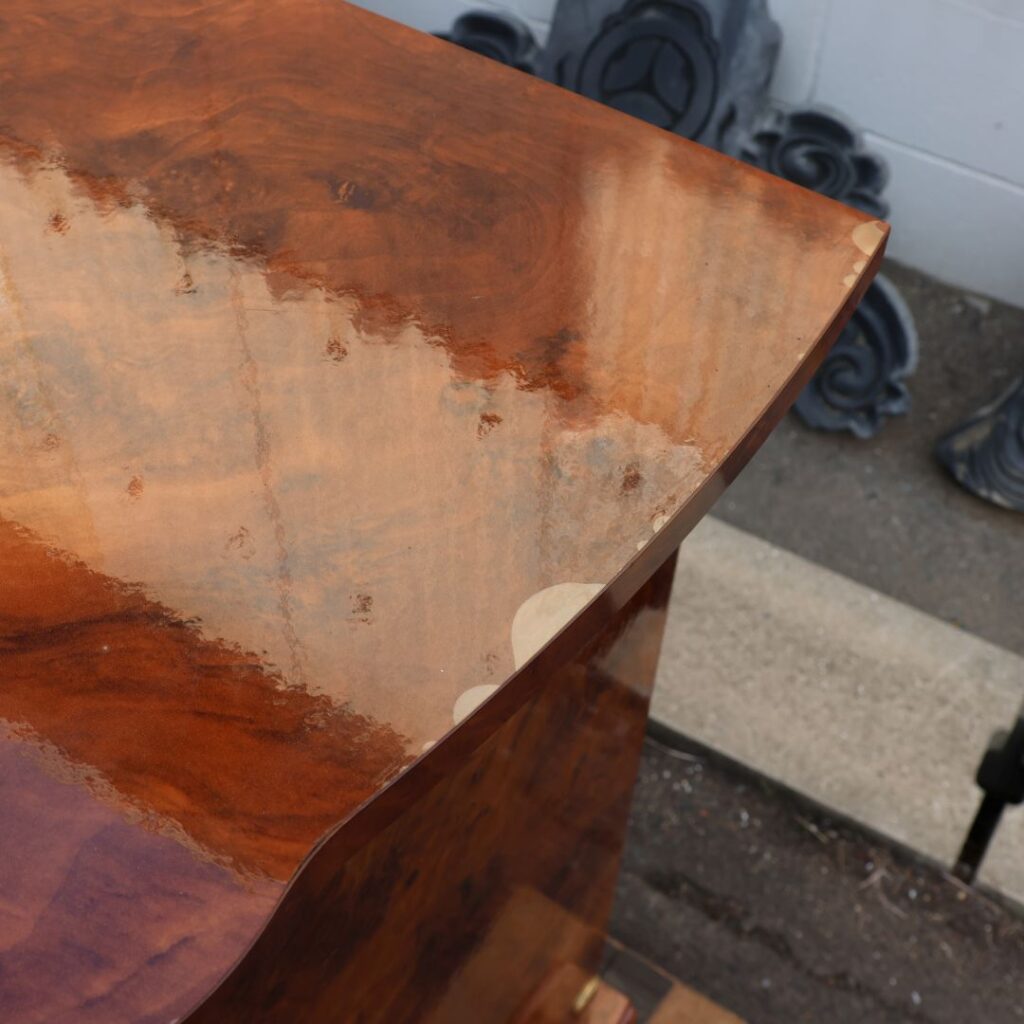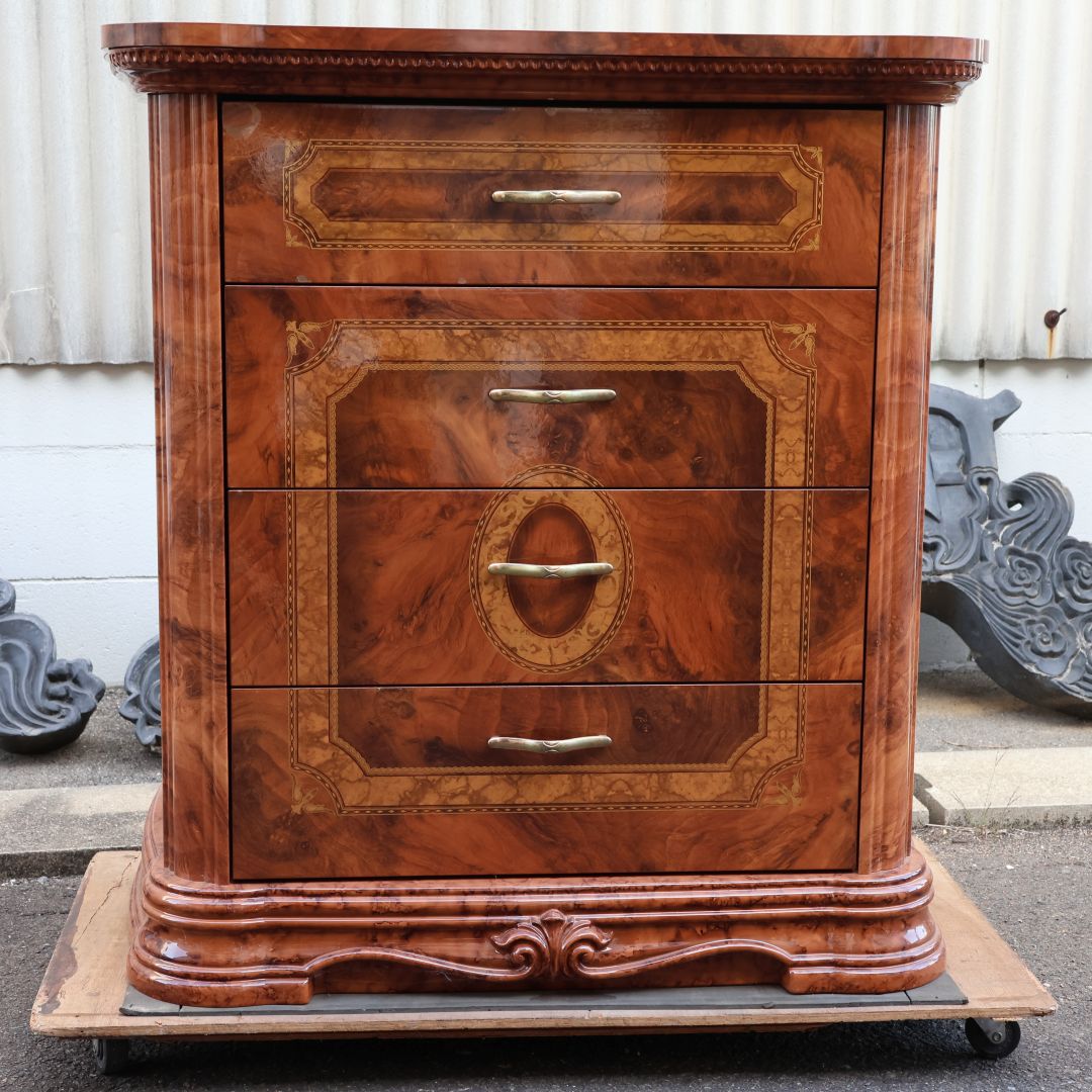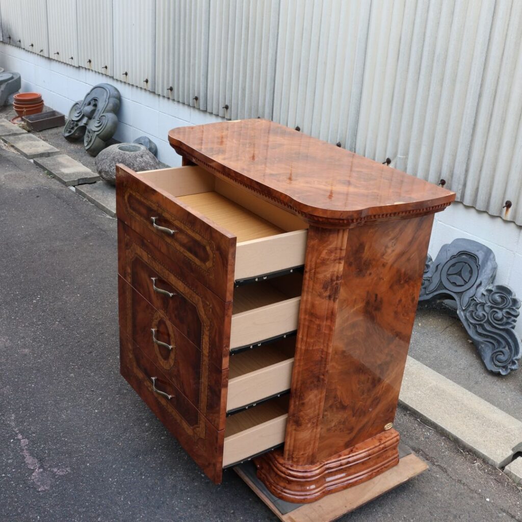 • 洗練された装飾: お写真のチェストにも見られるように、「バール杢(根瘤)」のような力強いウッドパターンや、繊細なインレイ(象嵌)風の装飾が、安価な家具にはない高級感を生んでいます。
