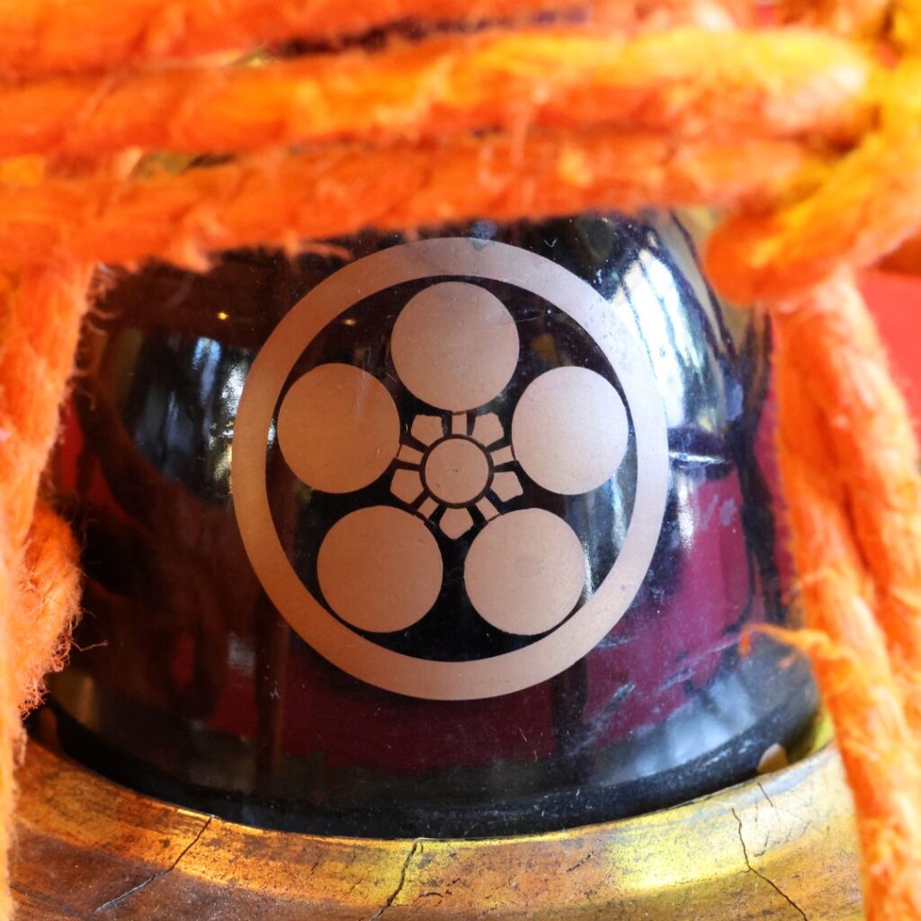 まず目を引くのは、胴(中央の木製の部分)に輝く加賀梅鉢紋です。