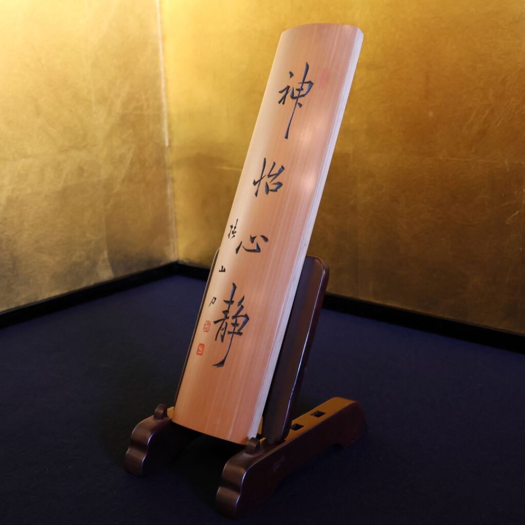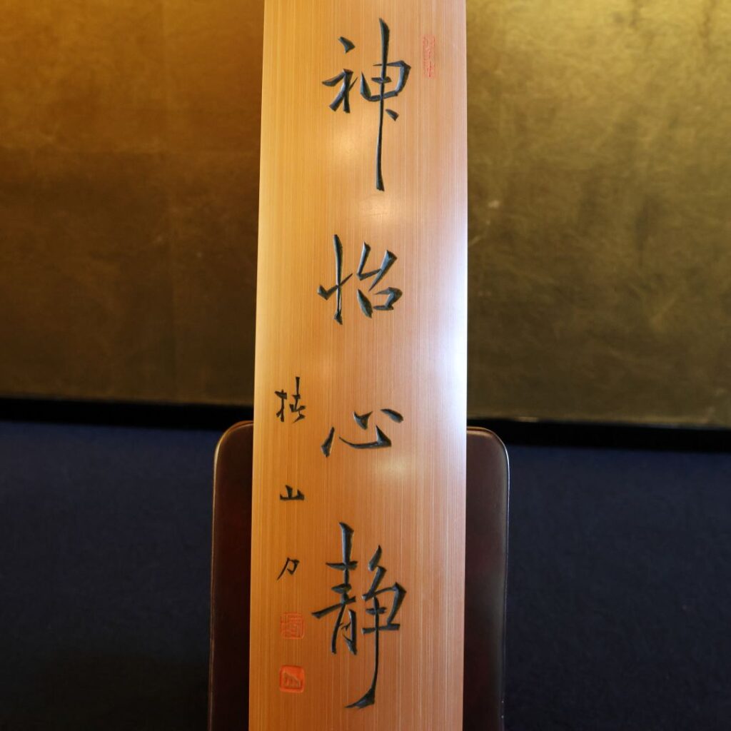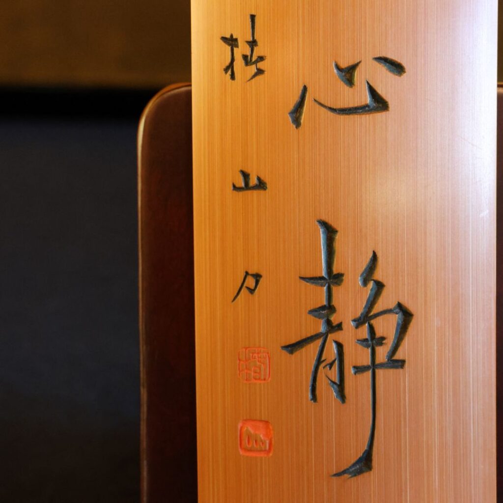 次に、茶道具としての良さを見ていきましょう。この茶合を茶席で使うことは、「今、この一服のお茶を通して、心を静め、精神を安らかにする時間を大切にしよう」その上、自然素材である竹に、力強くも雅な書が施されており、茶の湯における「わび・さび」の美意識や、自然との調和を重んじる精神を表現しています。