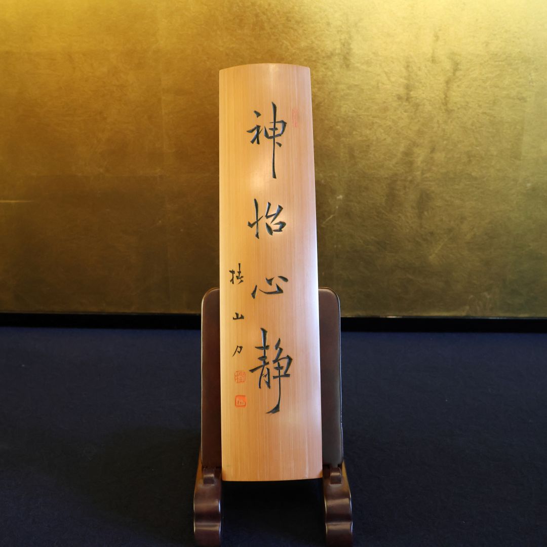 次に、茶道具としての良さを見ていきましょう。この茶合を茶席で使うことは、「今、この一服のお茶を通して、心を静め、精神を安らかにする時間を大切にしよう」その上、自然素材である竹に、力強くも雅な書が施されており、茶の湯における「わび・さび」の美意識や、自然との調和を重んじる精神を表現しています。