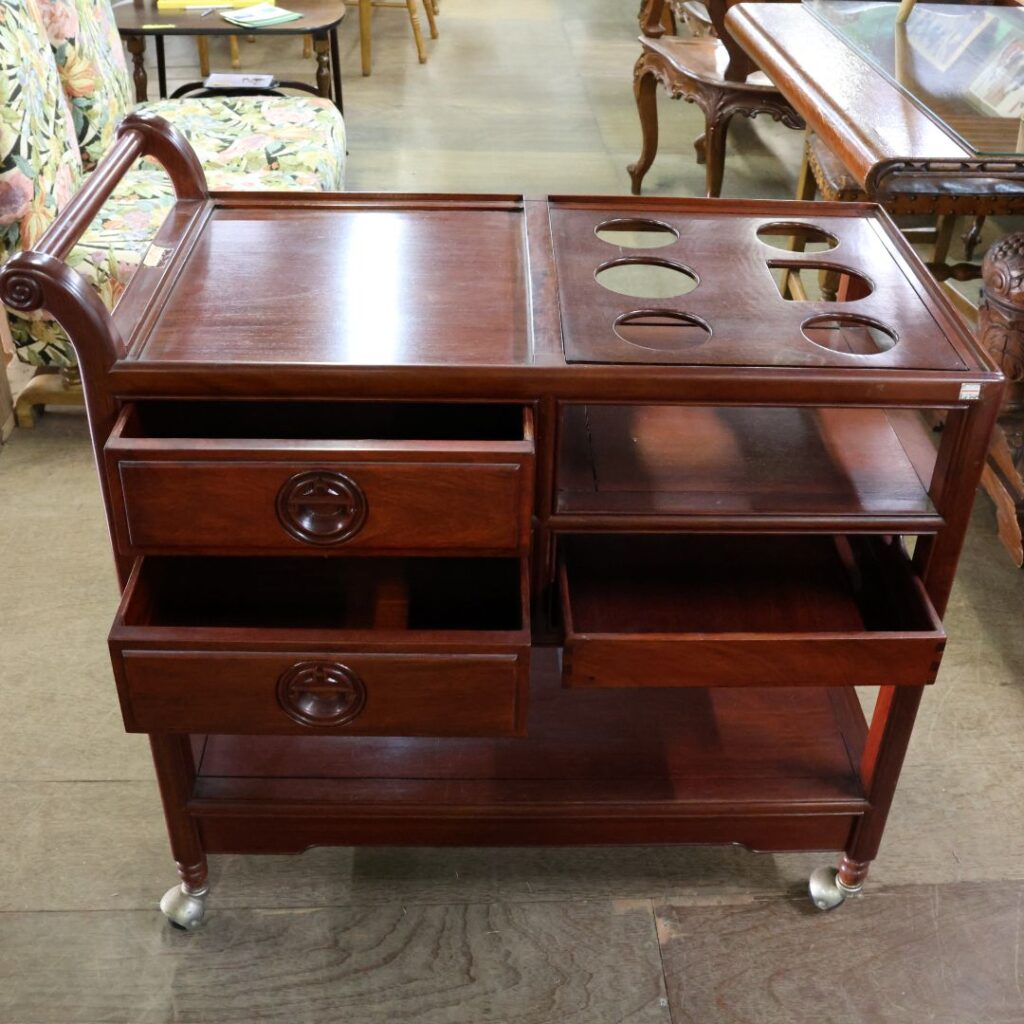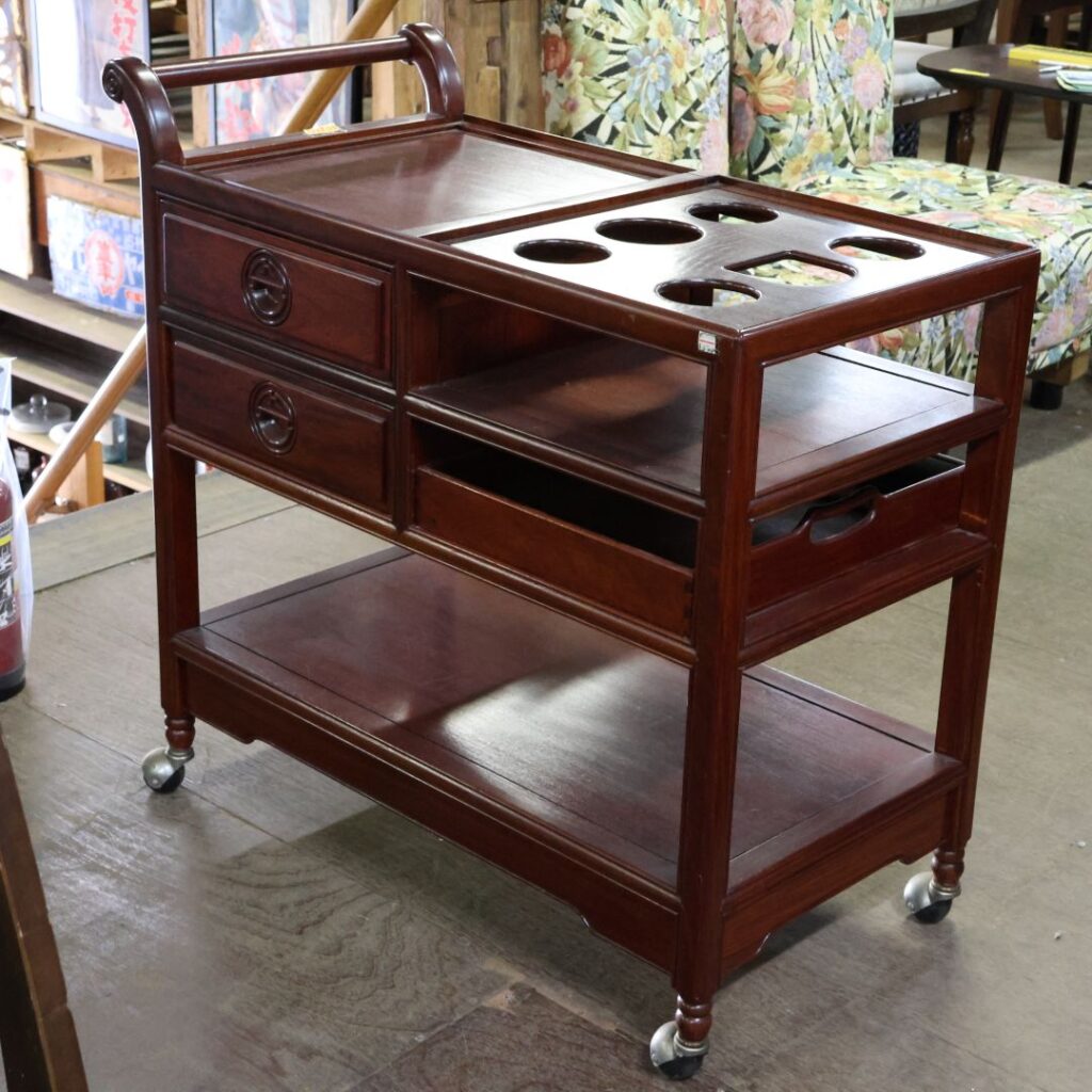 - キャスターの利便性: 本来、紫檀は非常に重い素材ですが、キャスターが付いていることで、その重厚な美しさを保ったまま、リビングからダイニングへ、あるいはゲストの前へとスムーズに移動させることができます。